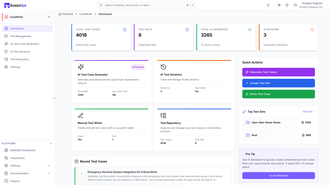 RabbitQA is a multi-agent AI platform that manages digital product quality end to end. From clarifying requirements to managing test coverage and scaling automation, it centrally orchestrates the product development lifecycle; anticipates risk, prevents defects, and protects revenue.