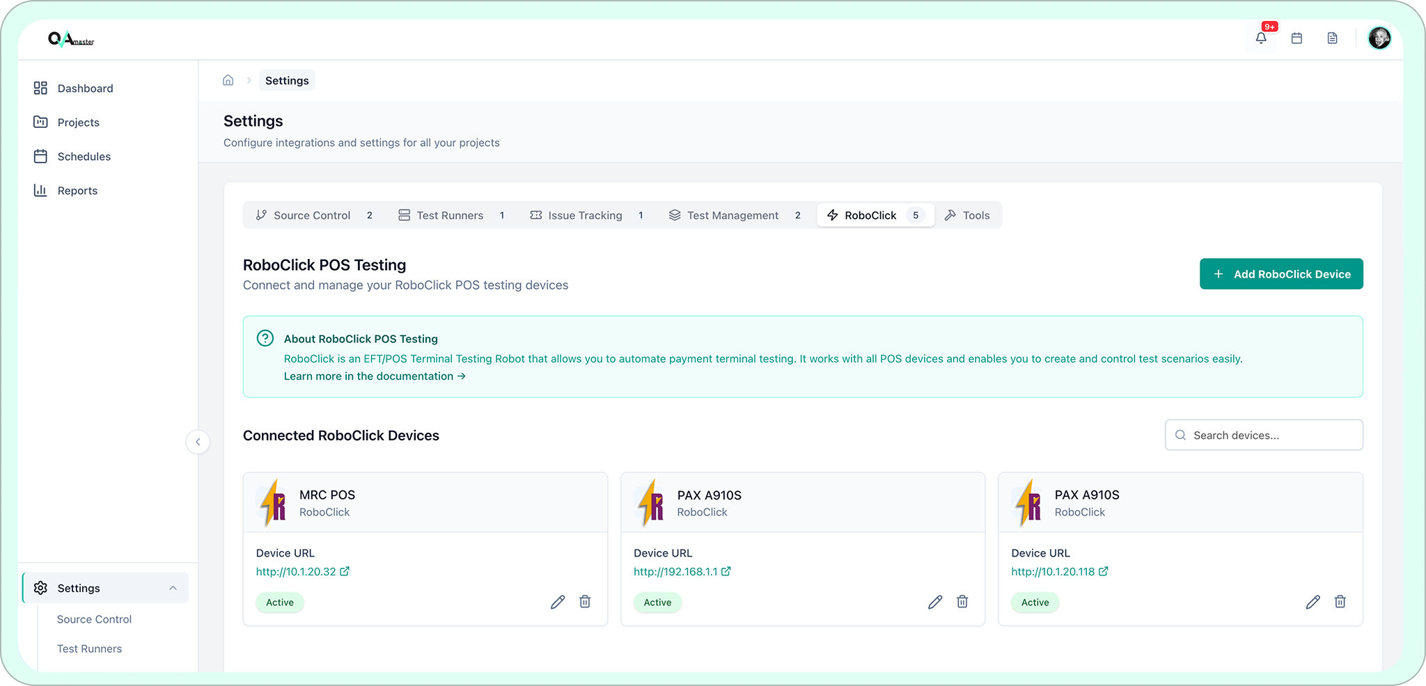 RoboClick is an innovative test platform that automates the physical testing processes of POS and SoftPOS devices end-to-end, combining robotic control, image processing (OCR), and AI-powered analysis technologies. By precisely simulating real user behavior, it performs key presses, card reads (chip and contactless), and screen validation processes without any human intervention
